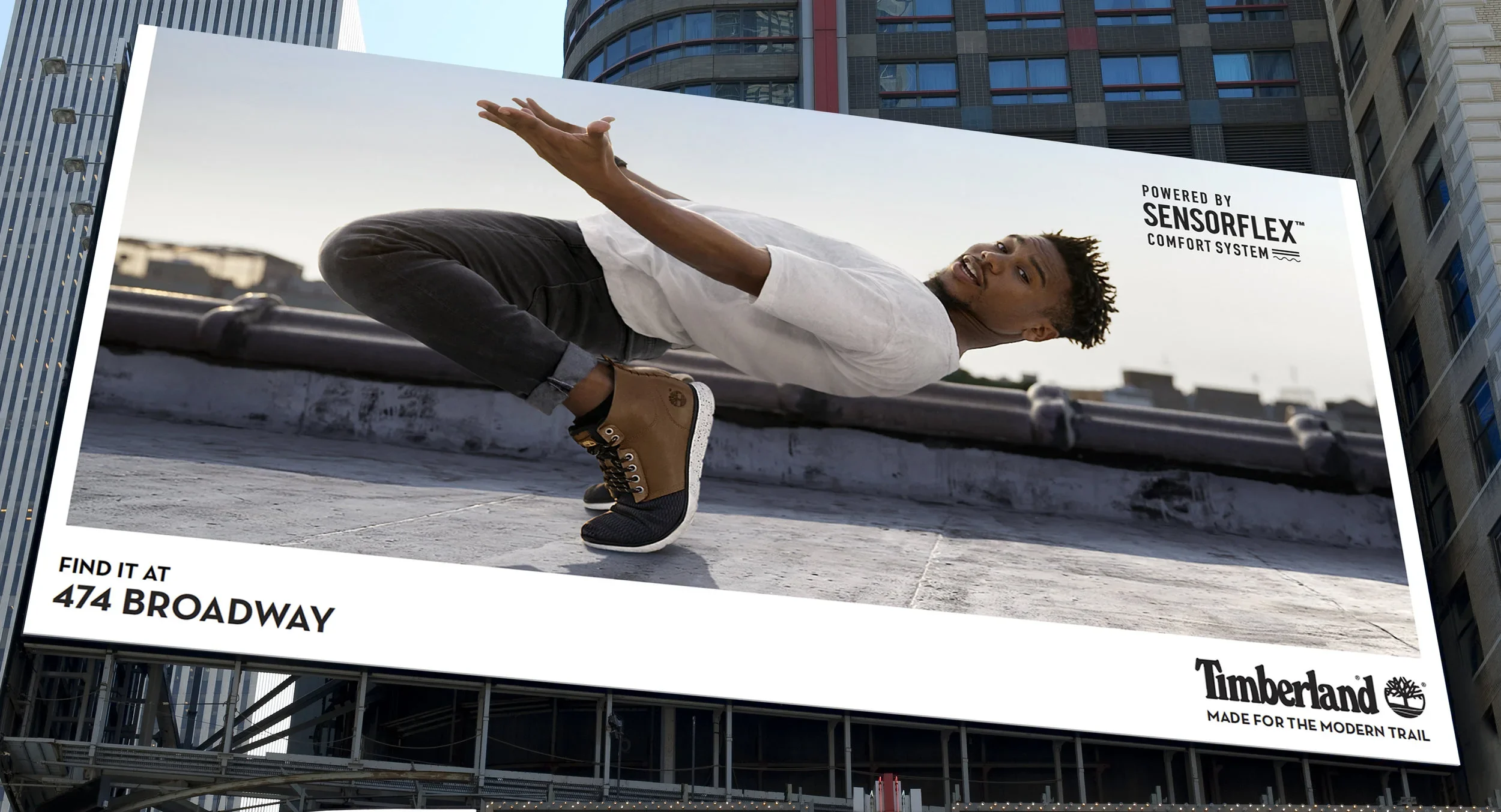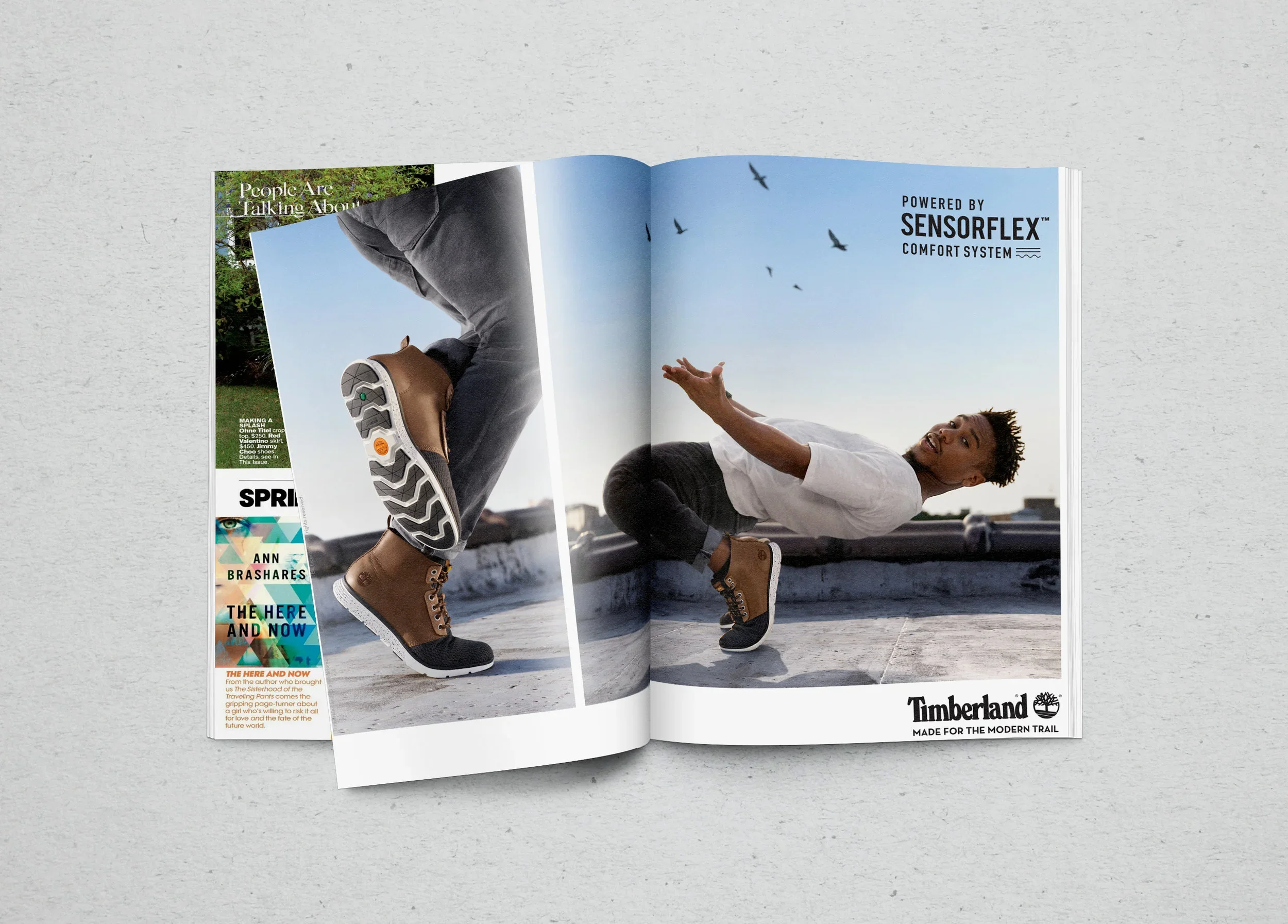 It ran across print, outdoor, digital, and interactive mobile formats, inviting users to virtually “test” the comfort system. The work repositioned Timberland from a rugged heritage brand to one that moves with modern, everyday versatility.